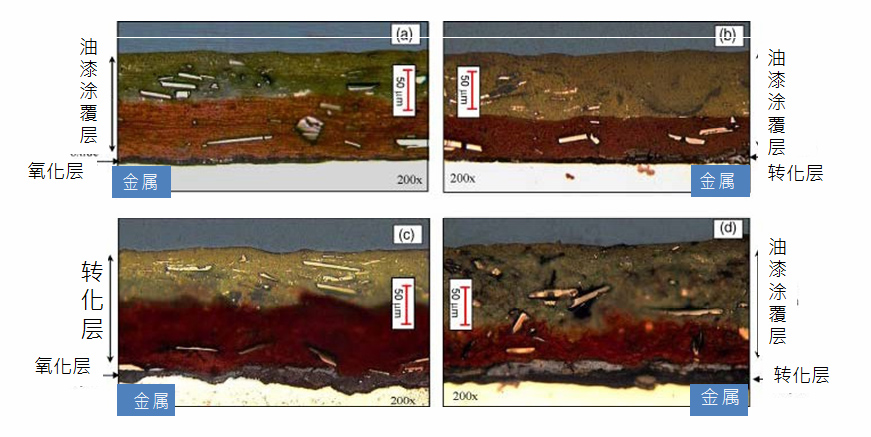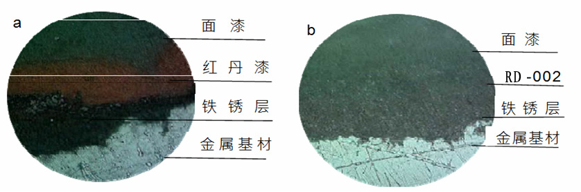 由图a可知锈层平整的覆盖着金属表面,隔离了漆与底材,同时锈层会继续反应,形成 “里面烂”,产生鼓泡和脱落等现象,从而是防腐层失效。由图b.可以看出,锈层已被反应, 基体表面出现粗糙面,锈转化到涂层中,锈转化层与基材表面有很好的锚合,能形成稳定的 结合,增加了涂层间的附着力。从b可见转化层的内部结构致密均匀。从图a与b对比,可以 看出转化层的厚度没有增厚,这是因为锈转化剂能渗透到锈的内部,并能渗透到基材有锈迹 的地方,而不只是表面覆盖层。